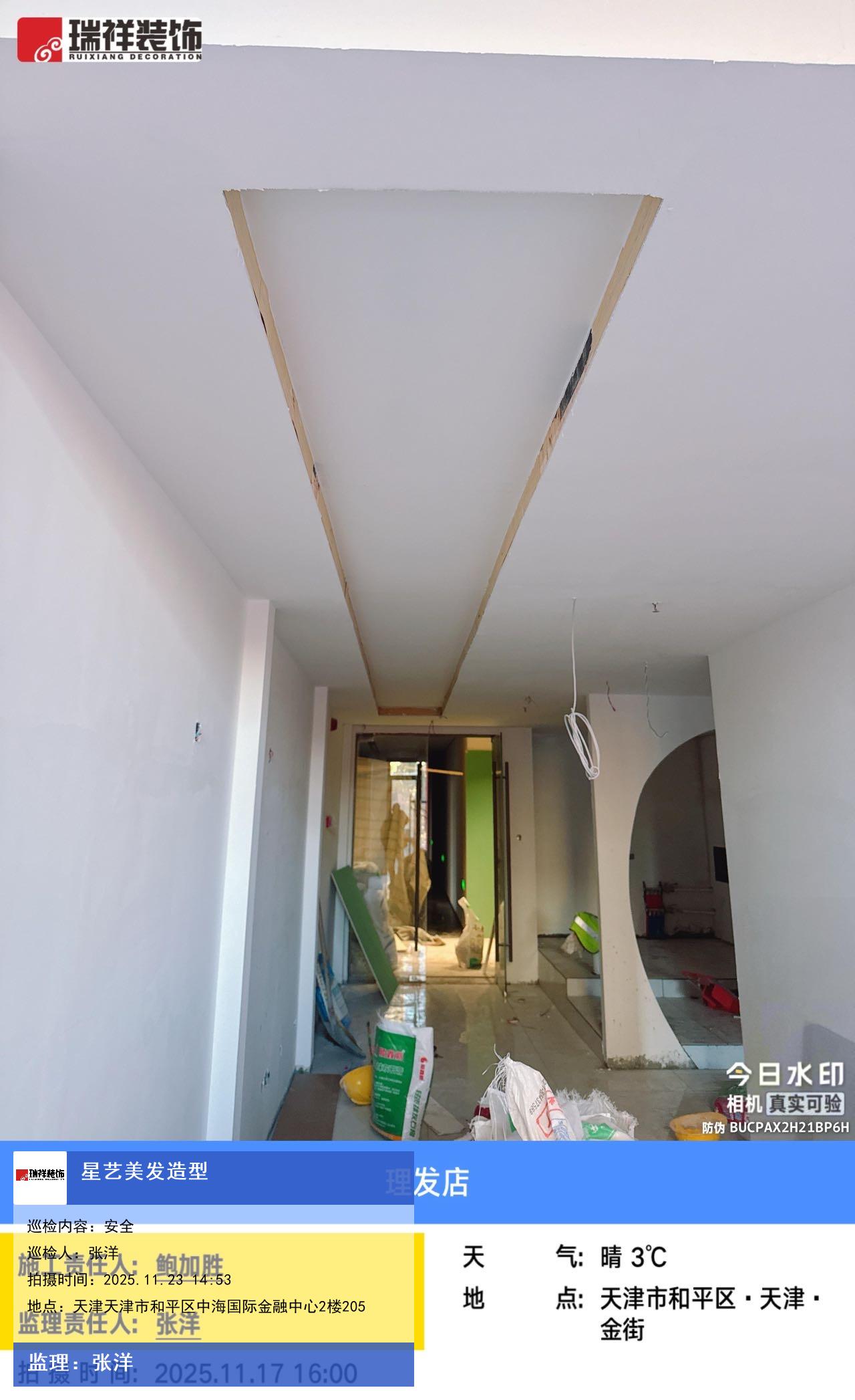 版权声明:本站所有文章除特别标注授权发布外,其他文字内容均为原创,享有著作权保护,未经许可不得以任何形式进行转载(包括且不限于:媒体、网站、公众号等)。本文链接 -> 星艺美发造型商业装修2025年11月23日工程监理巡检