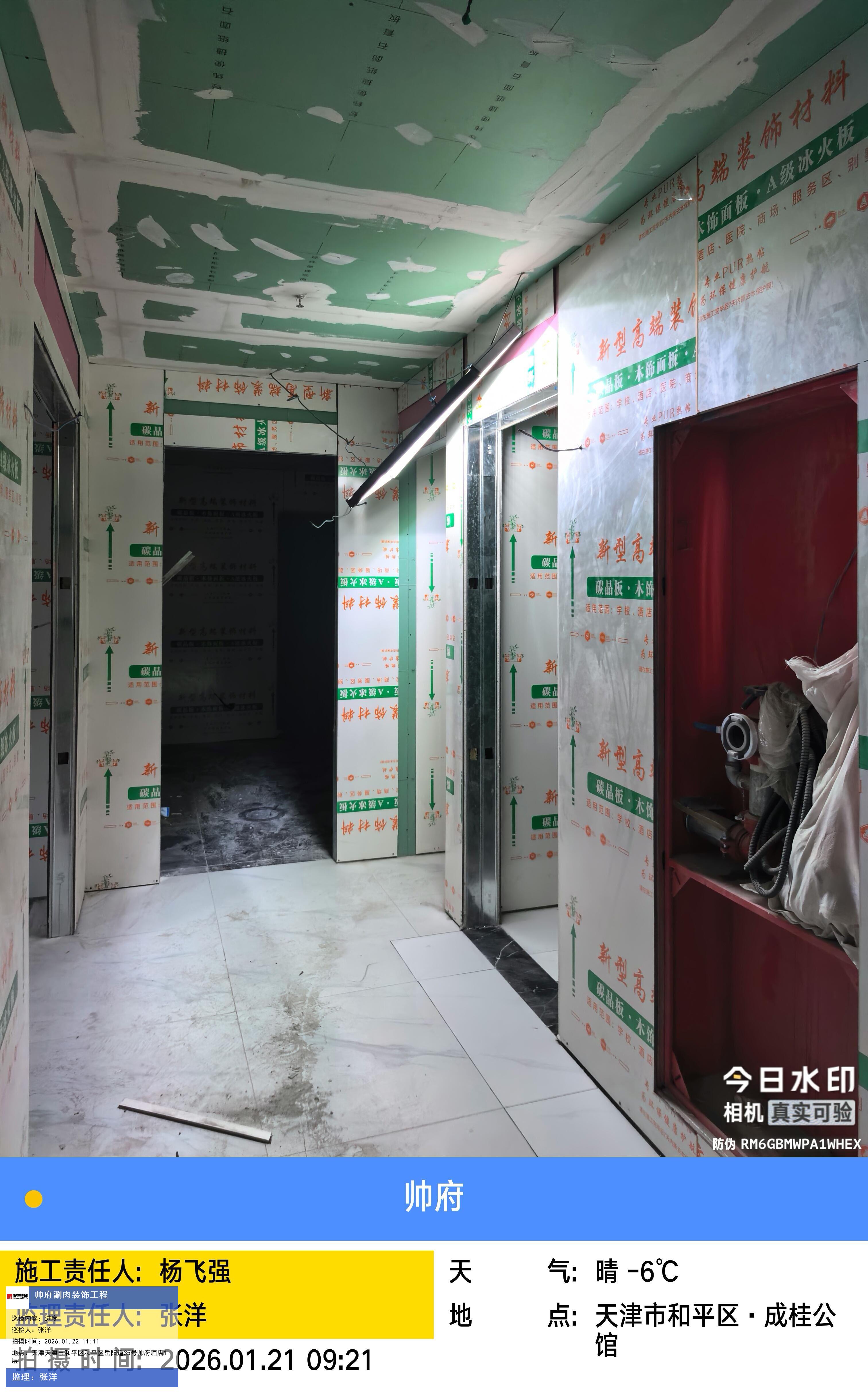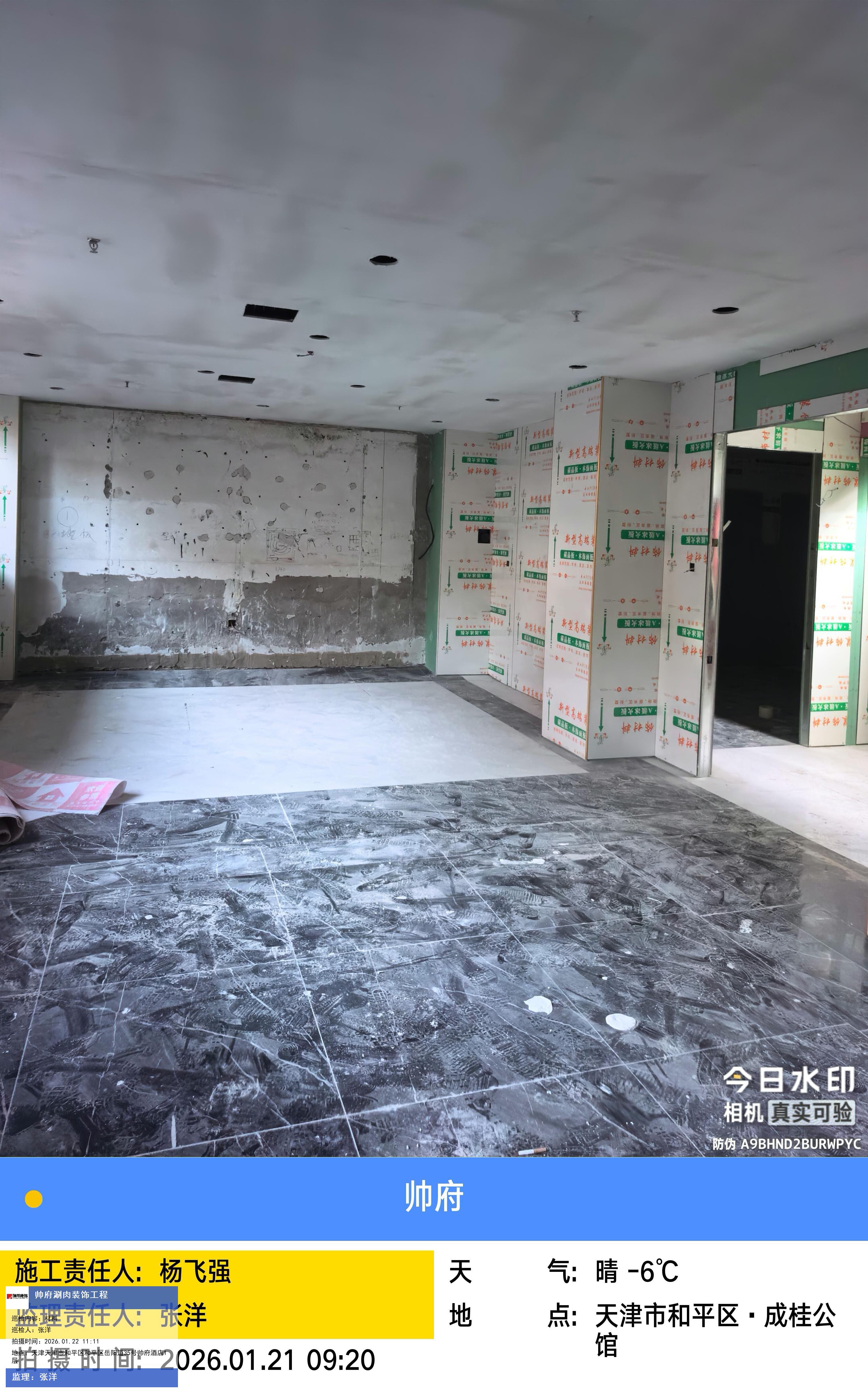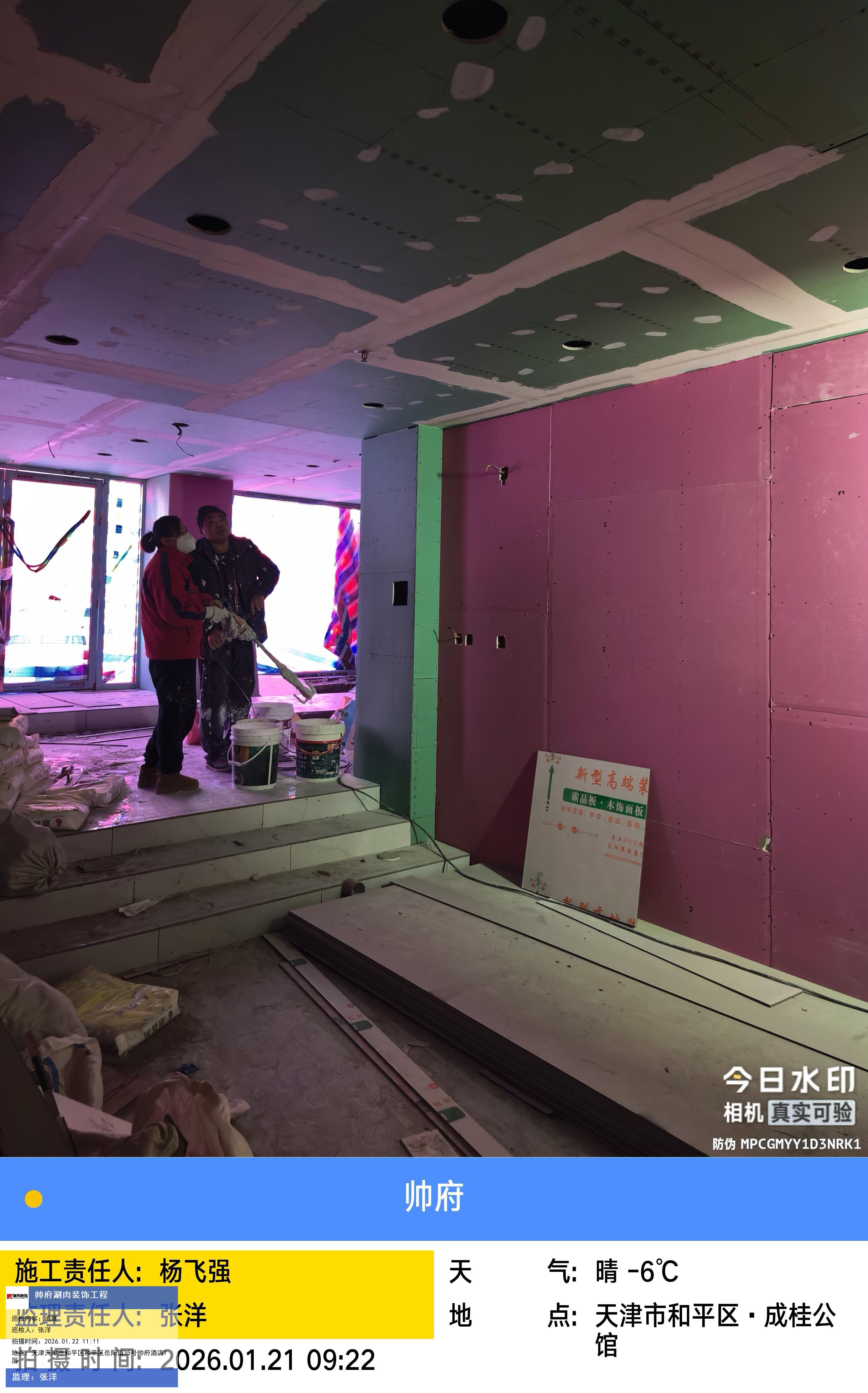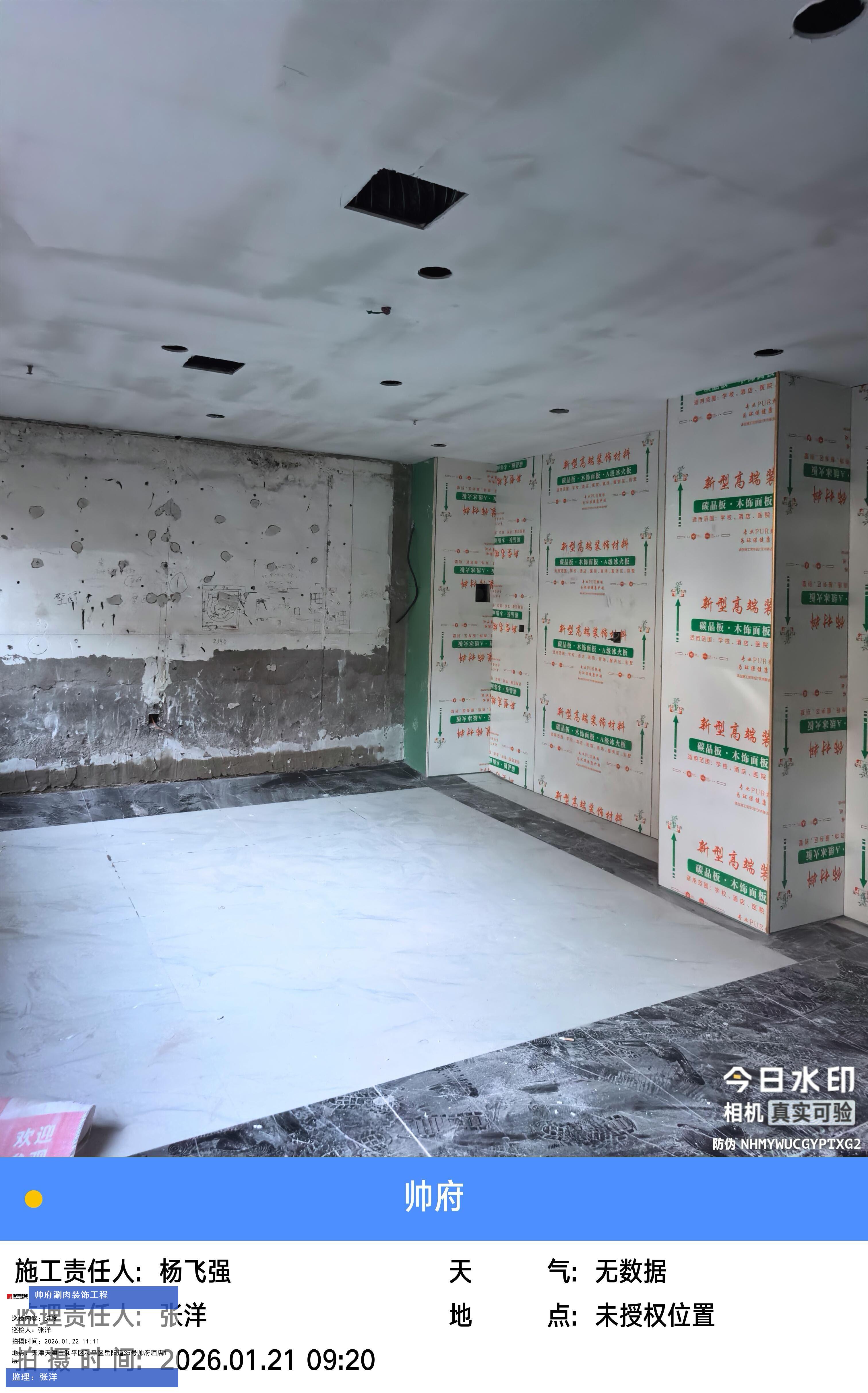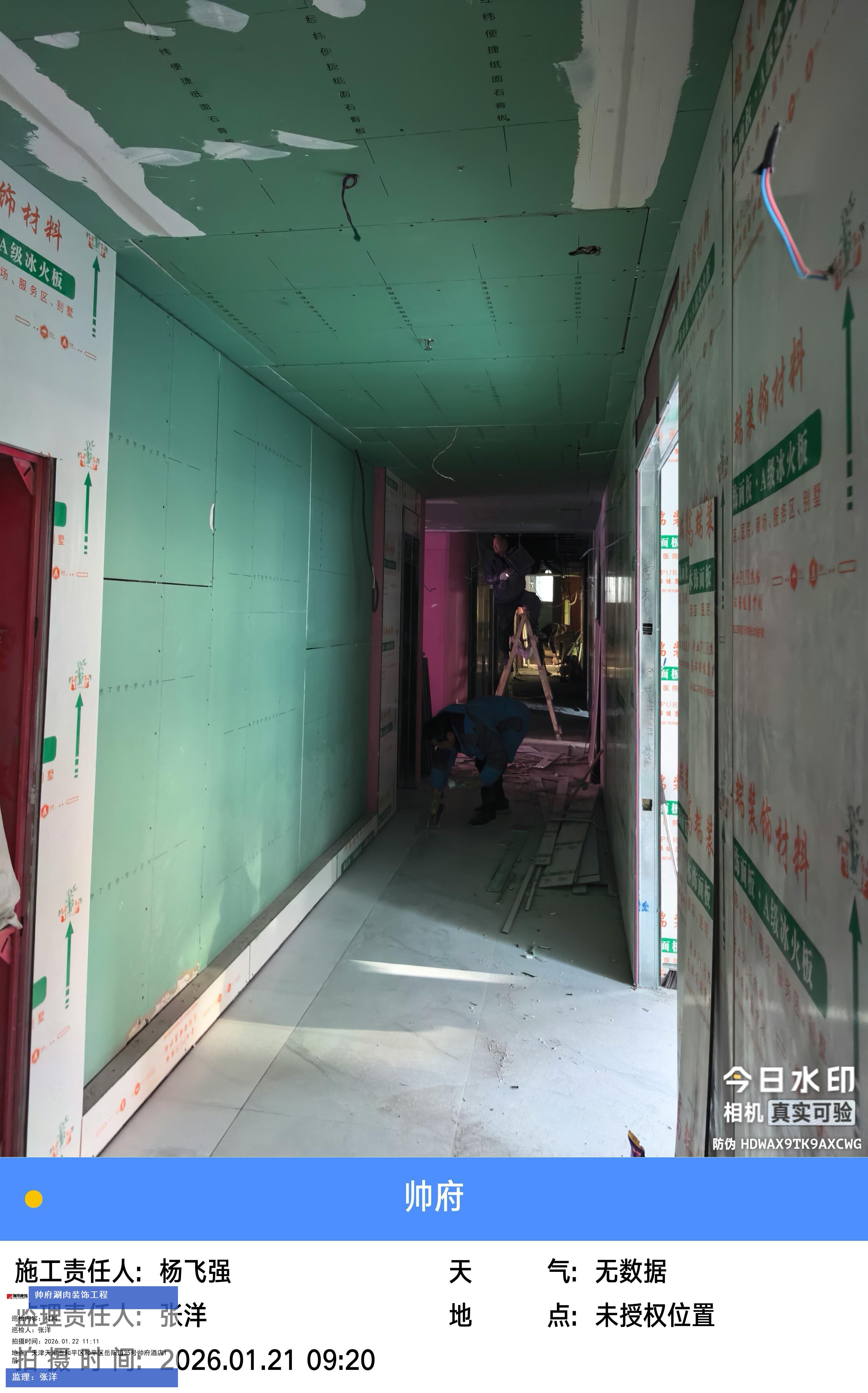 版权声明:本站所有文章除特别标注授权发布外,其他文字内容均为原创,享有著作权保护,未经许可不得以任何形式进行转载(包括且不限于:媒体、网站、公众号等)。本文链接 -> 天津帅府酒店管理有限公司餐饮分公司婚宴酒楼装修2026年01月22日工程监理巡检