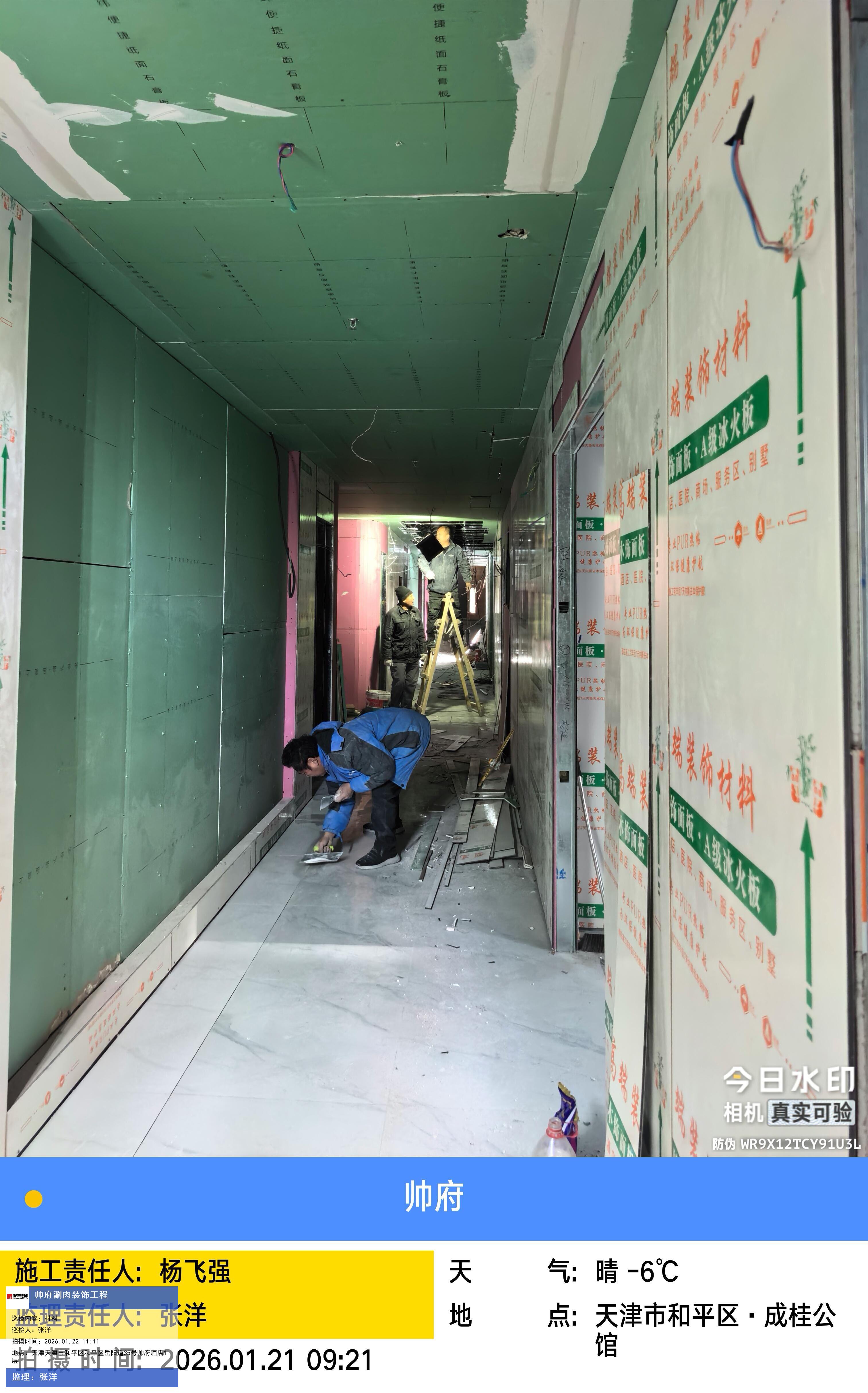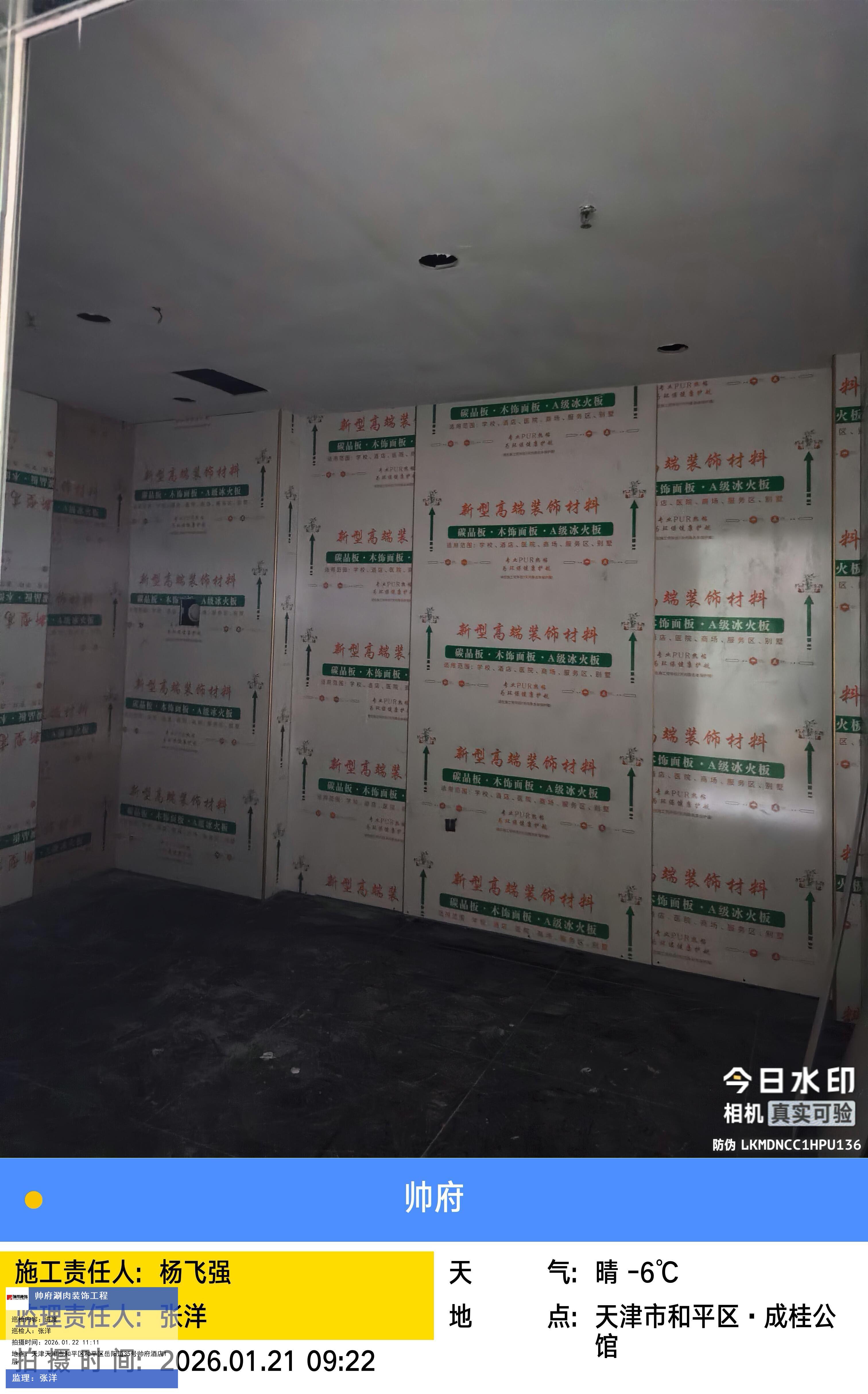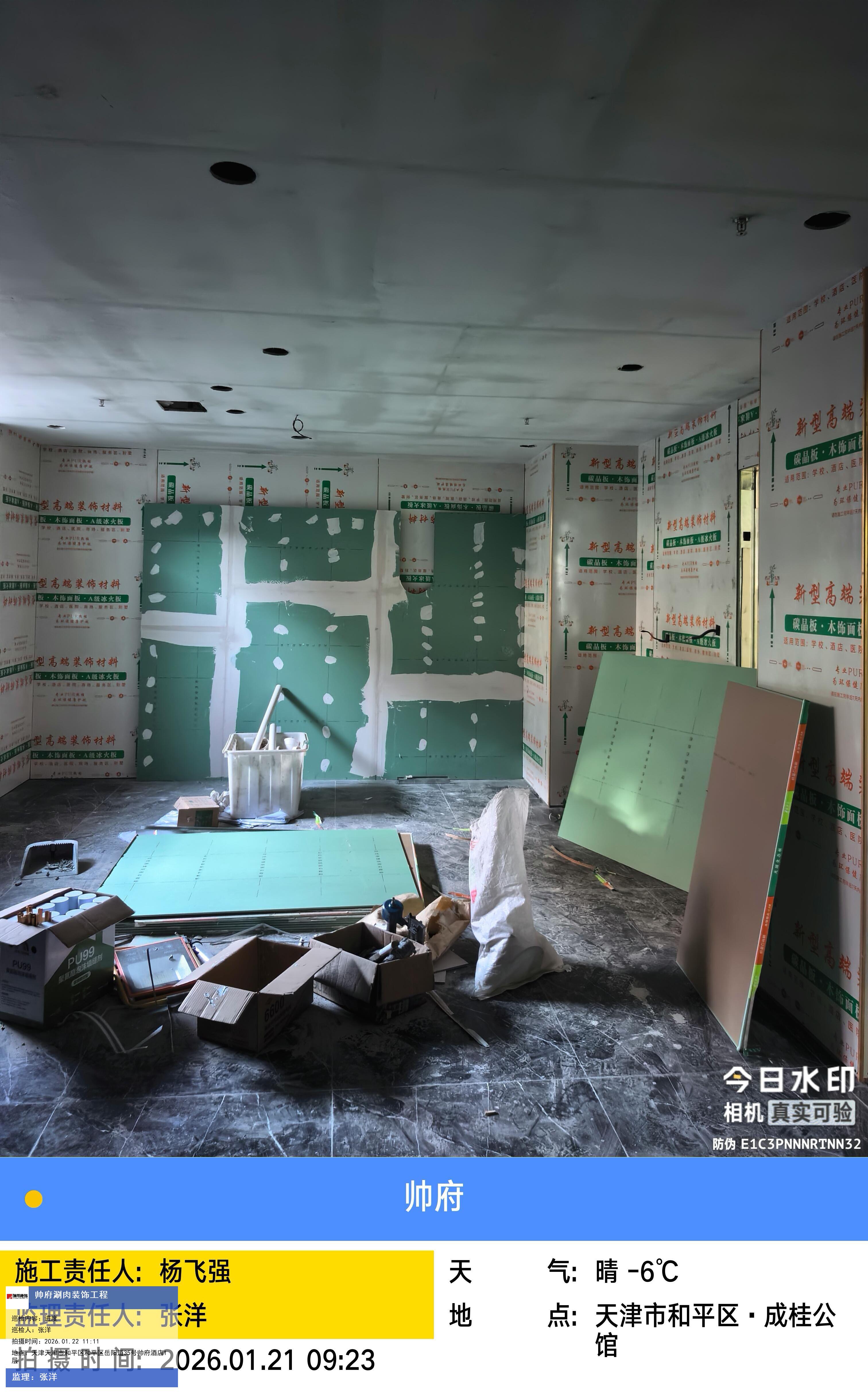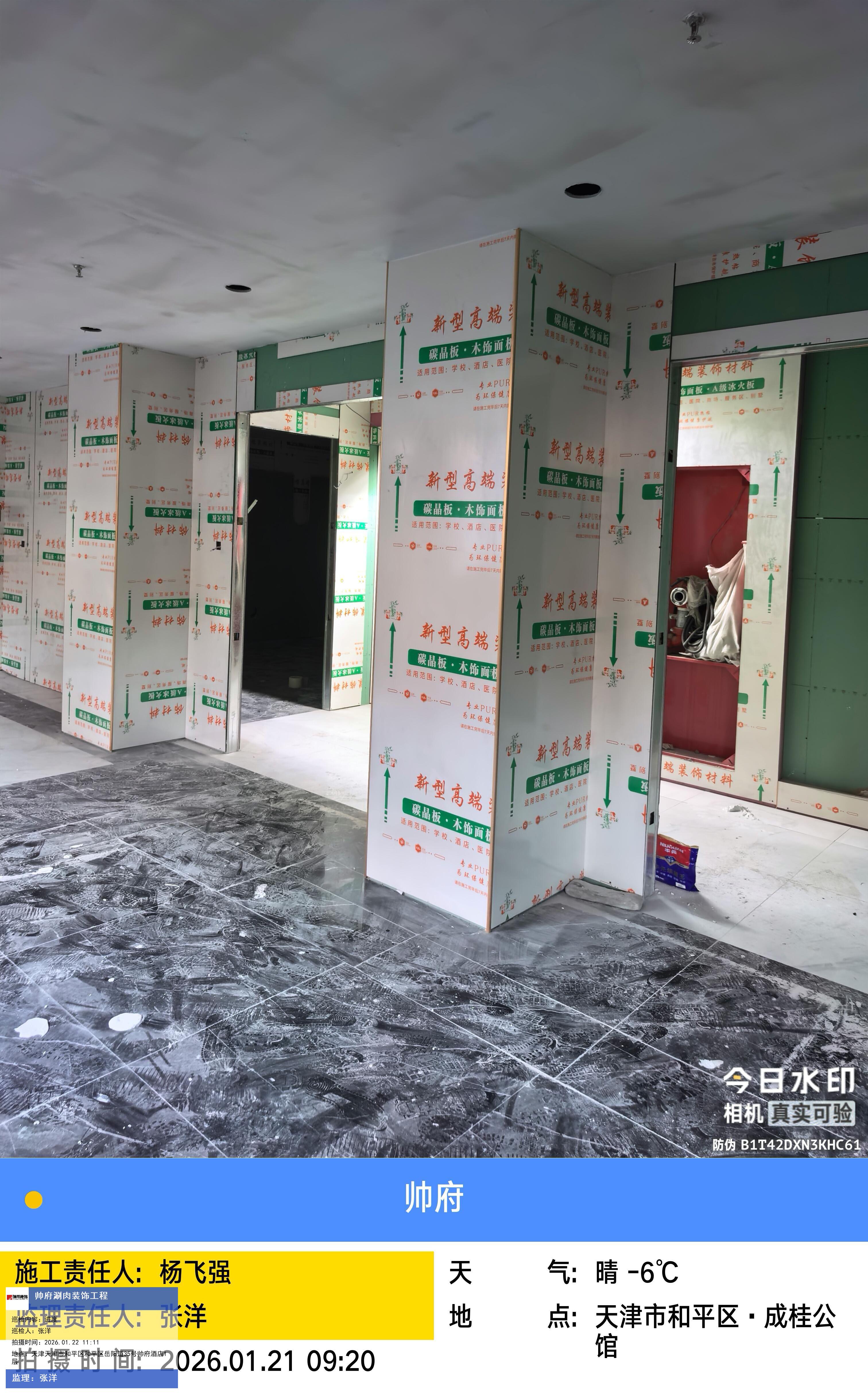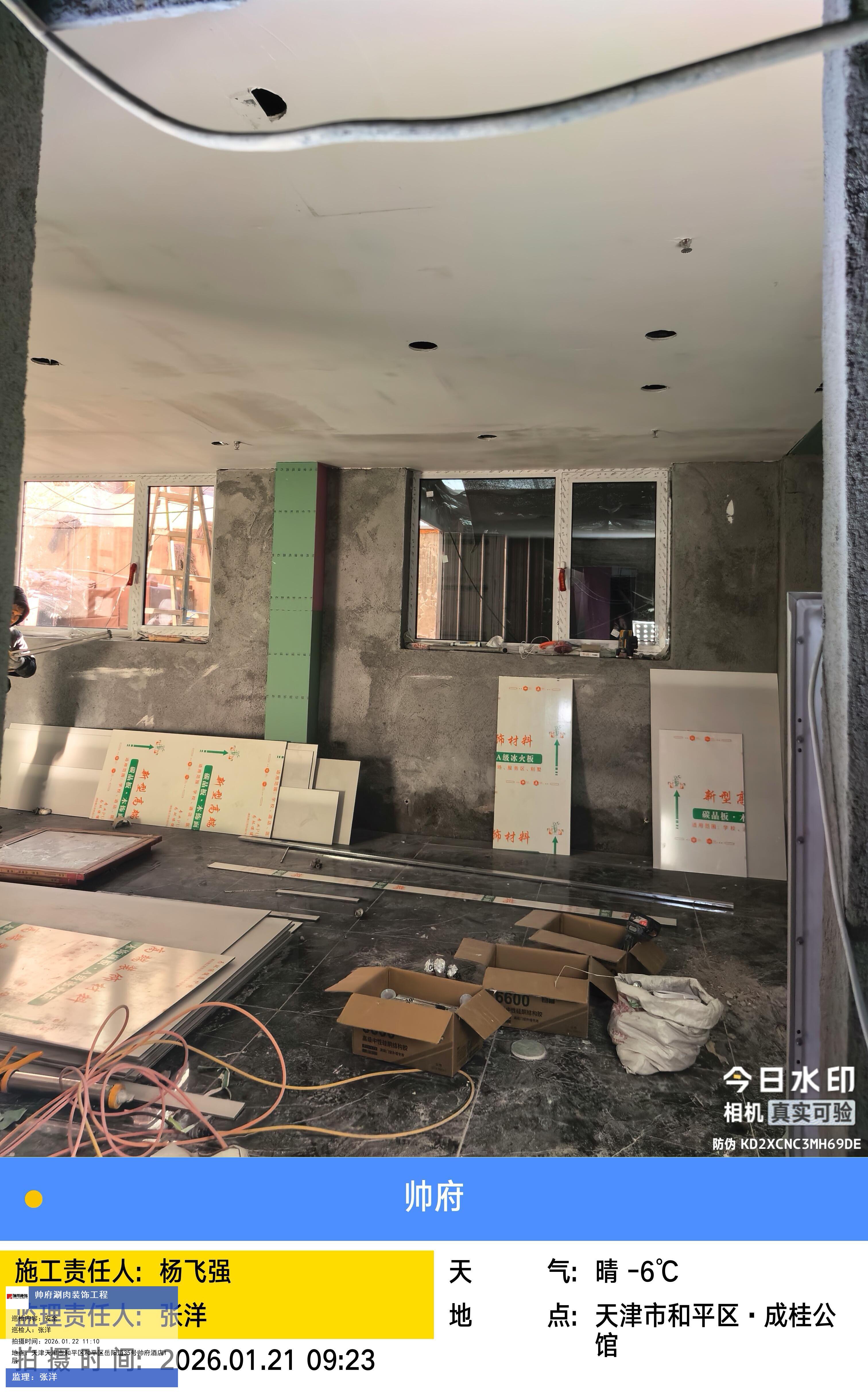 版权声明:本站所有文章除特别标注授权发布外,其他文字内容均为原创,享有著作权保护,未经许可不得以任何形式进行转载(包括且不限于:媒体、网站、公众号等)。本文链接 -> 天津帅府酒店管理有限公司餐饮分公司婚宴酒楼装修2026年01月22日工程监理巡检