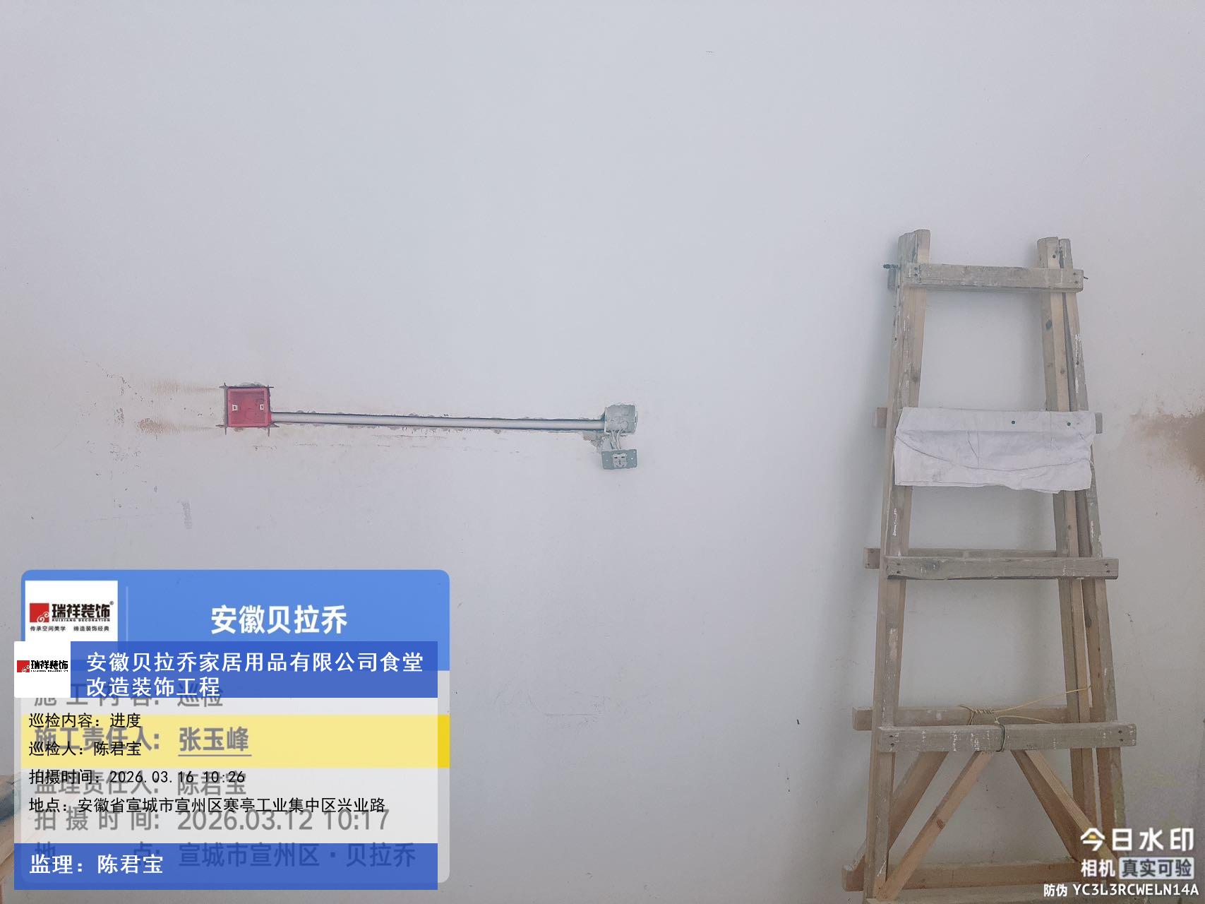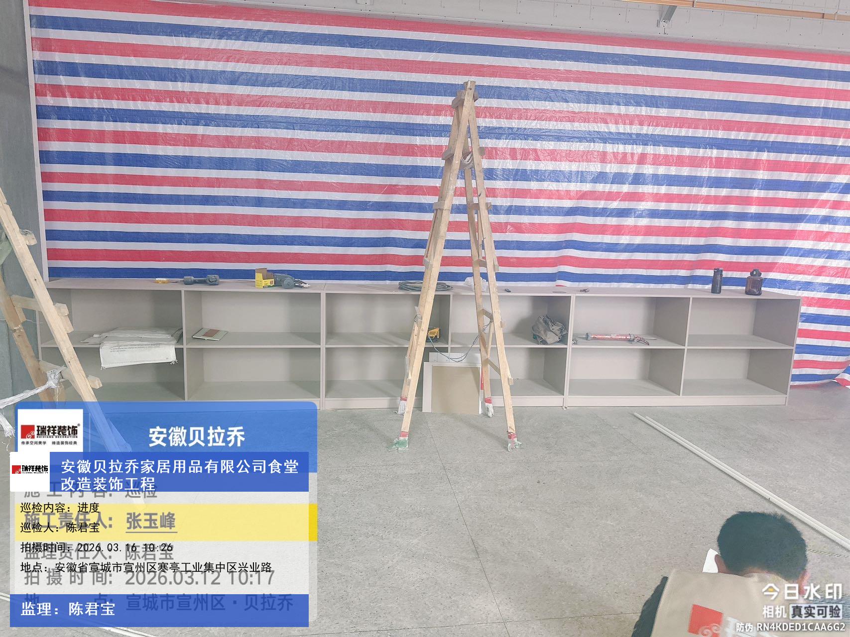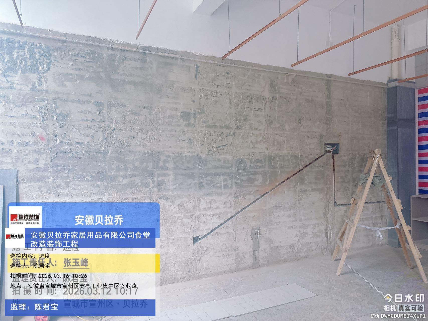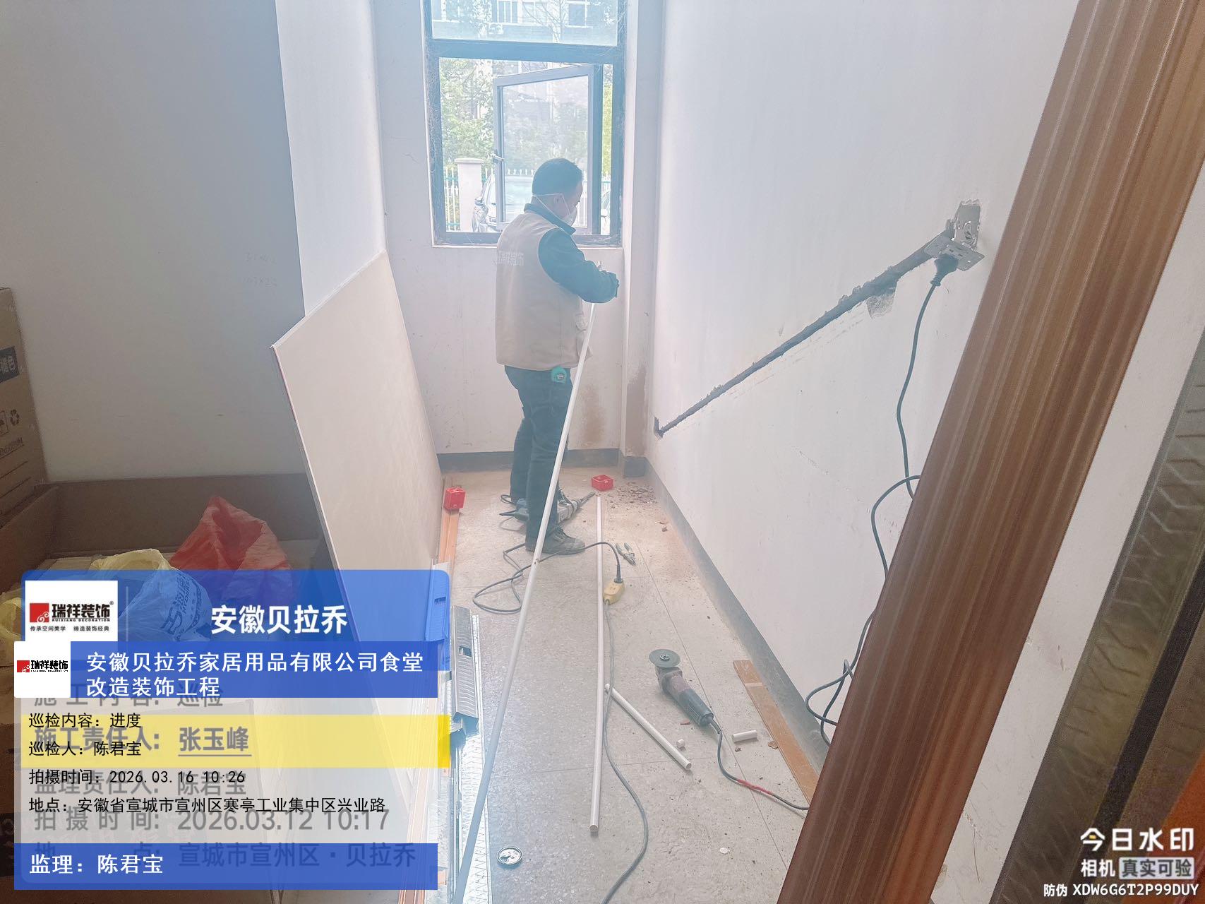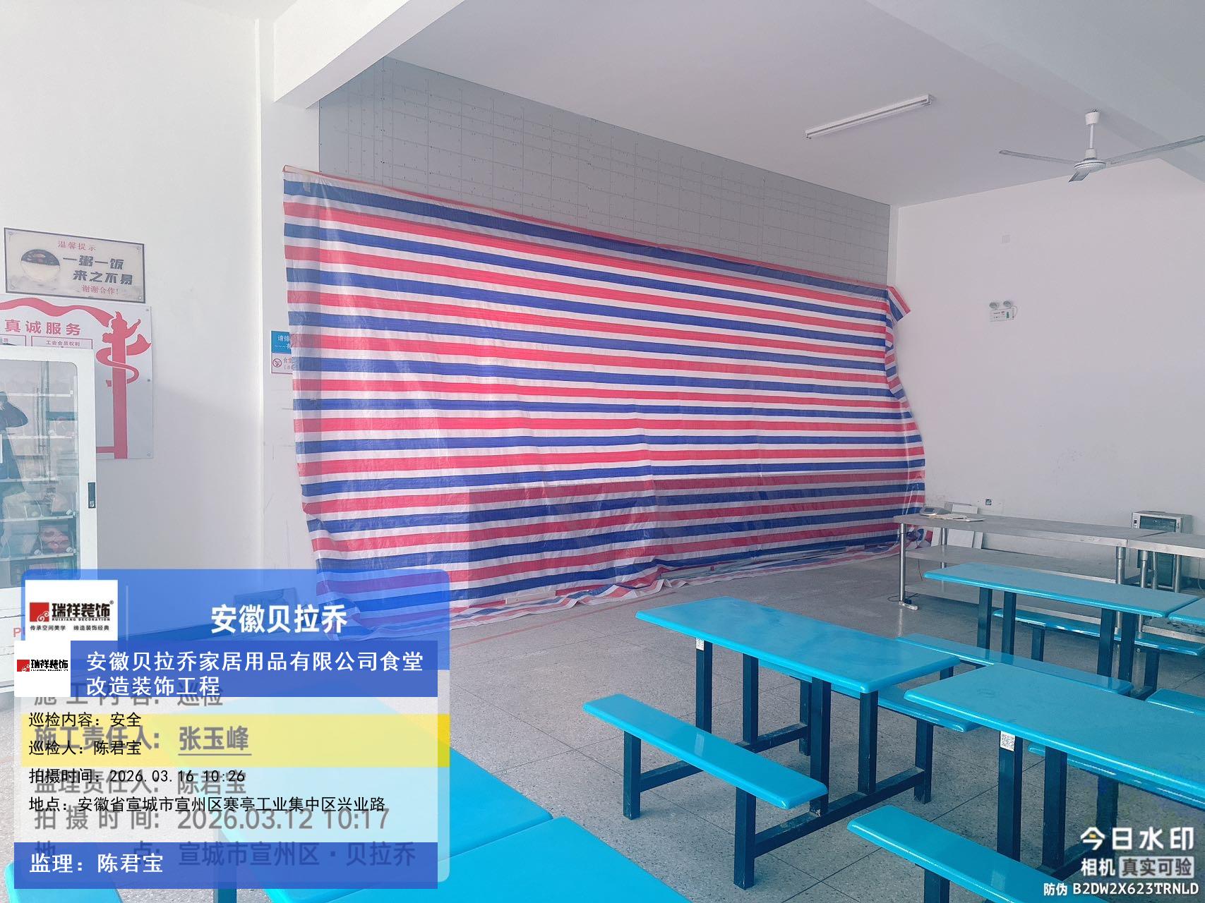 版权声明:本站所有文章除特别标注授权发布外,其他文字内容均为原创,享有著作权保护,未经许可不得以任何形式进行转载(包括且不限于:媒体、网站、公众号等)。本文链接 -> 安徽贝拉乔家居用品有限公司食堂改造酒楼装修设计2026年03月16日工程监理巡检