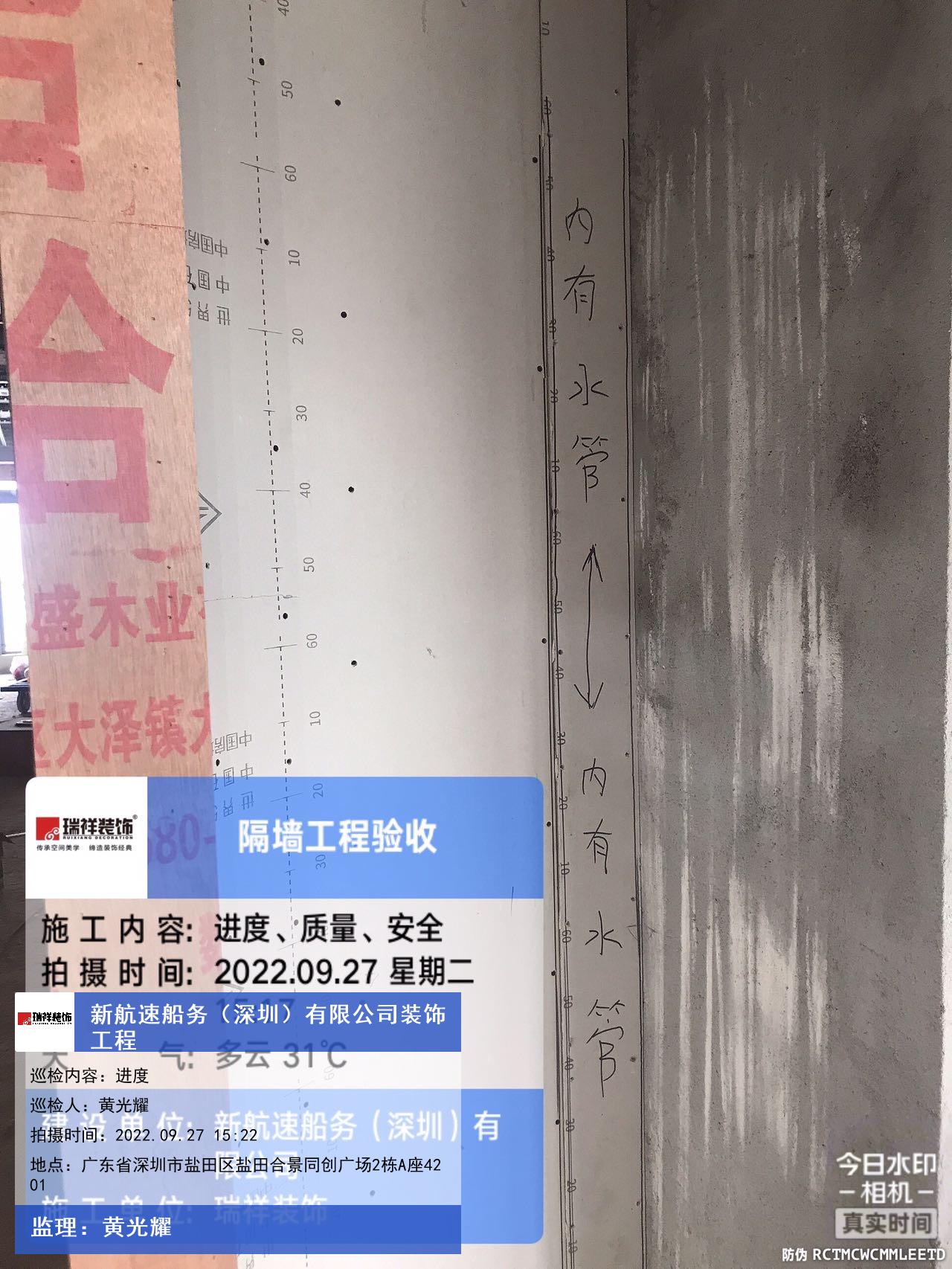 版权声明:本站所有文章除特别标注授权发布外,其他文字内容均为原创,享有著作权保护,未经许可不得以任何形式进行转载(包括且不限于:媒体、网站、公众号等)。本文链接 -> 新航速船务(深圳)有限公司办公楼装修公司2022年09月27日工程监理巡检