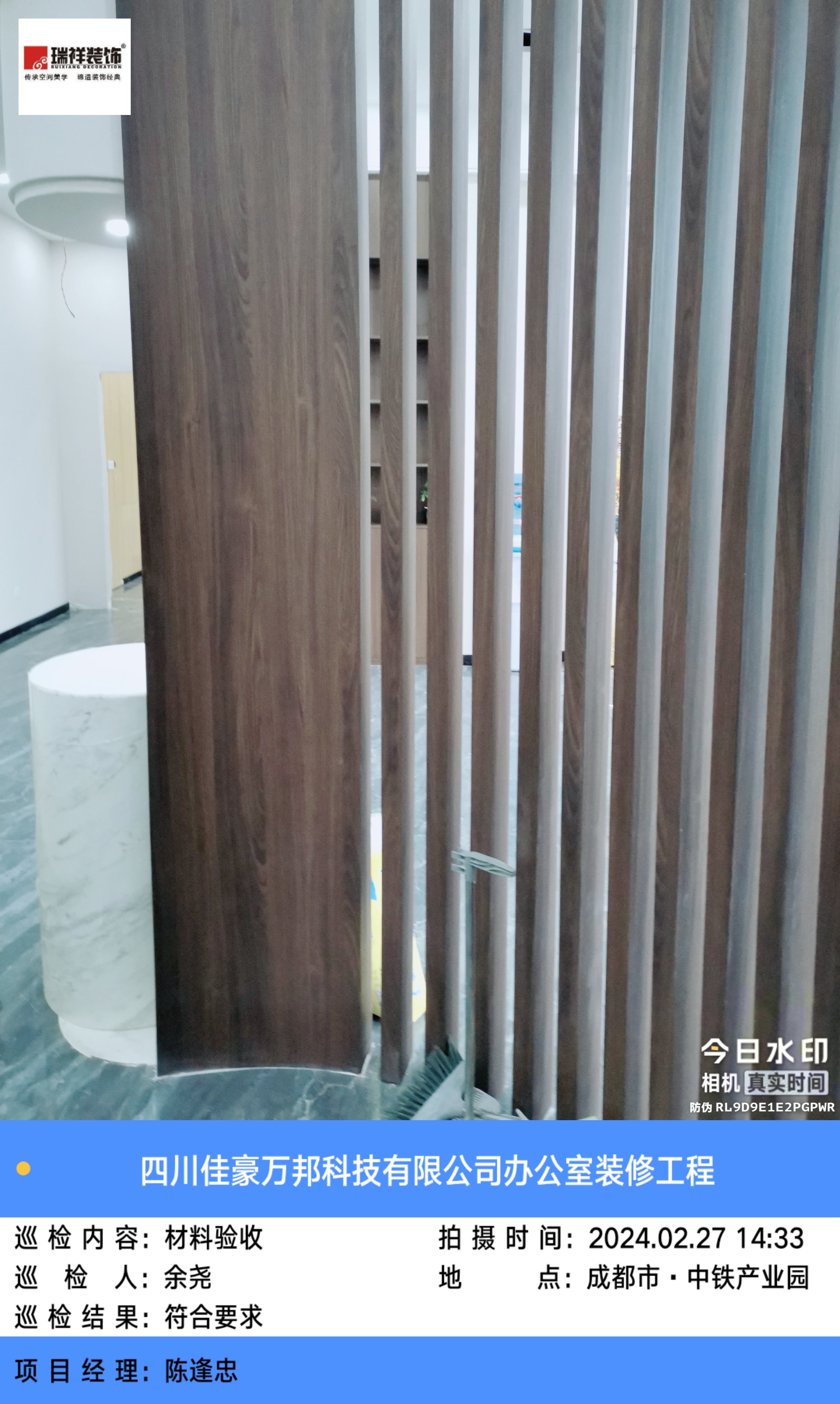 版权声明:本站所有文章除特别标注授权发布外,其他文字内容均为原创,享有著作权保护,未经许可不得以任何形式进行转载(包括且不限于:媒体、网站、公众号等)。本文链接 -> 四川佳豪万邦科技有限公司办公室装修效果图2024年02月27日工程监理巡检